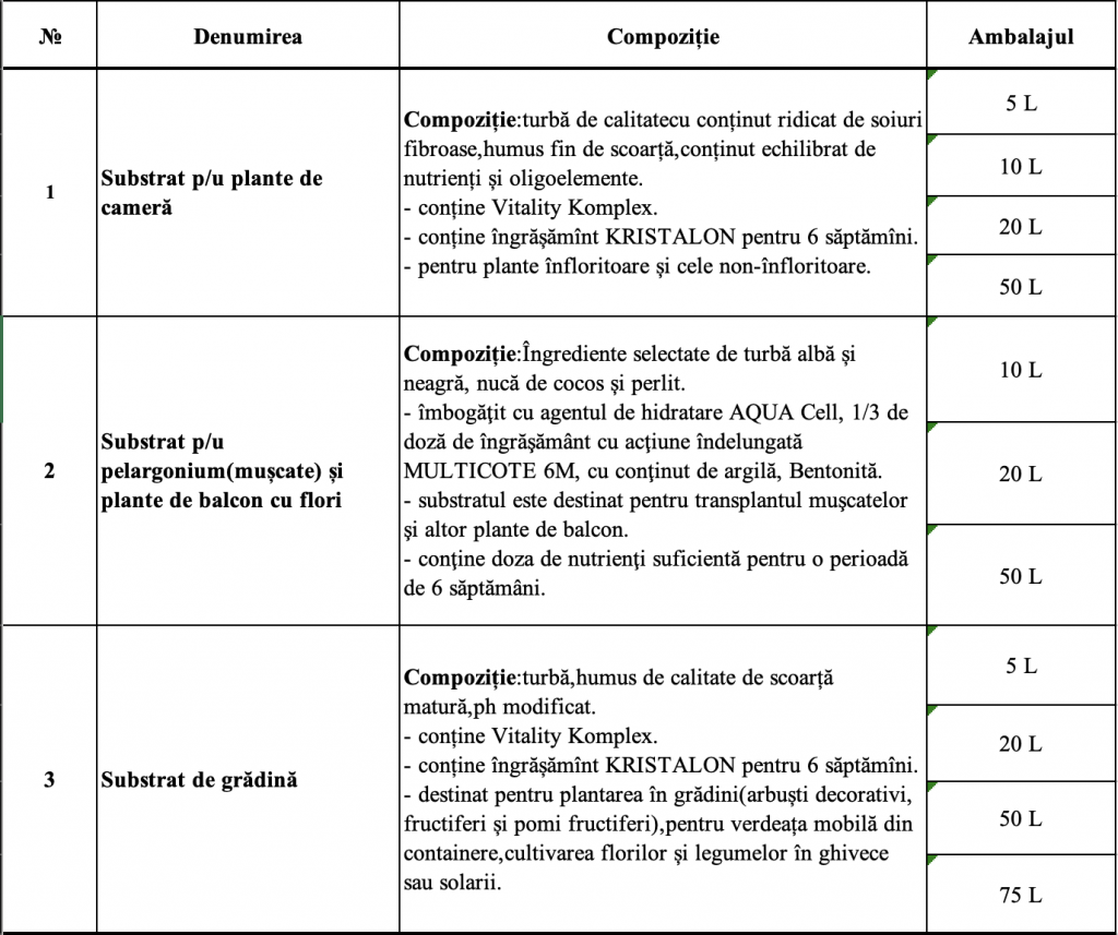 | № | Denumirea produsului | Fabricant | Substanta activă | Ambalaj | Norma de consum la 1/kg ha | |